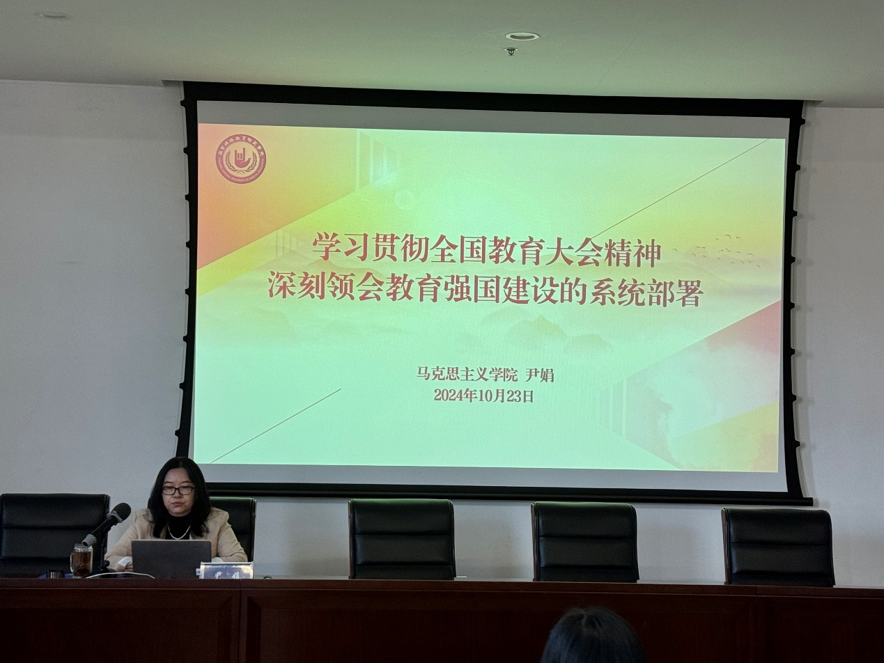 学校马克思主义学院尹娟教授给大家做了题为《学习贯彻全国教育大会精神 深刻领会教育强国建设的系统部署》的主题报告。尹教授从全国教育大会的背景、意义以及教育强国建设的系统部署等方面,深刻、系统阐述了教育强国的科学内涵、基本路径以及教育强国建设的战略任务和重大举措等,揭示了大力弘扬教育家精神,建设高素质专业化教师队伍对于高校落实立德树人根本任务、助推教育强国建设的深远意义。勉励大家以教育家精神为引领,涵养高尚师德,增强育人本领,当好学生的引路人。