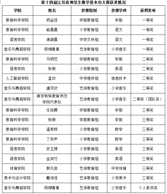 近日,由江苏省教育厅主办、江苏省教师教育专业指导委员会承办的第十四届江苏省师范生教学基本功大赛圆满结束。我校学子凭借扎实的专业功底与出色的教学素养,在激烈角逐中脱颖而出,共斩获18个奖项,其中一等奖4项,二等奖5项,三等奖8项,个人单项奖1项。其中,学前教育、小学教育(语文方向)、汉语言文学三个专业实现了我校在该赛事中一等奖“零”的历史性突破。