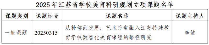 近日,江苏省学校美育教学指导委员会公布了《2025年江苏省学校美育科研规划立项课题名单》,我校美术与设计学院李敏老师主持申报的《从补偿到发展:艺术疗愈融入江苏特殊教育学校数智化美育课程的路径研究》获批一般课题。本次申报共收到249项课题,经省学校美育教学指导委员会组织专家评审,最终37项课题立项,其中重点课题7项、一般课题30项。